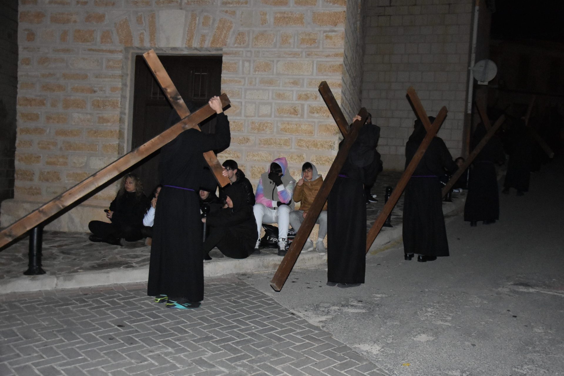 Con salida desde el templo parroquial, y prácticamente a oscuras, solo iluminados por la luz de la luna y las pequeñas hogueras que se van encendiendo en cada una de las diferentes estaciones penitenciales junto con el sonido del timbal que va marcando el paso.