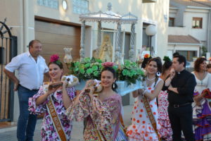 Coincidiendo con el final de la época estival, el Barrio del Rocío, se encuentra inmerso en sus tradicionales fiestas que esta tarde se han iniciado con la Romería que iniciaba su recorrido en el Recinto Ferial ubicado en las zonas deportivas, trasladando las imágenes de la Blanca Paloma hasta el Templo Parroquial, donde se ha oficiado una misa, cantada por el coro rociero “Aires del Rocío”, dirigido por José Torres