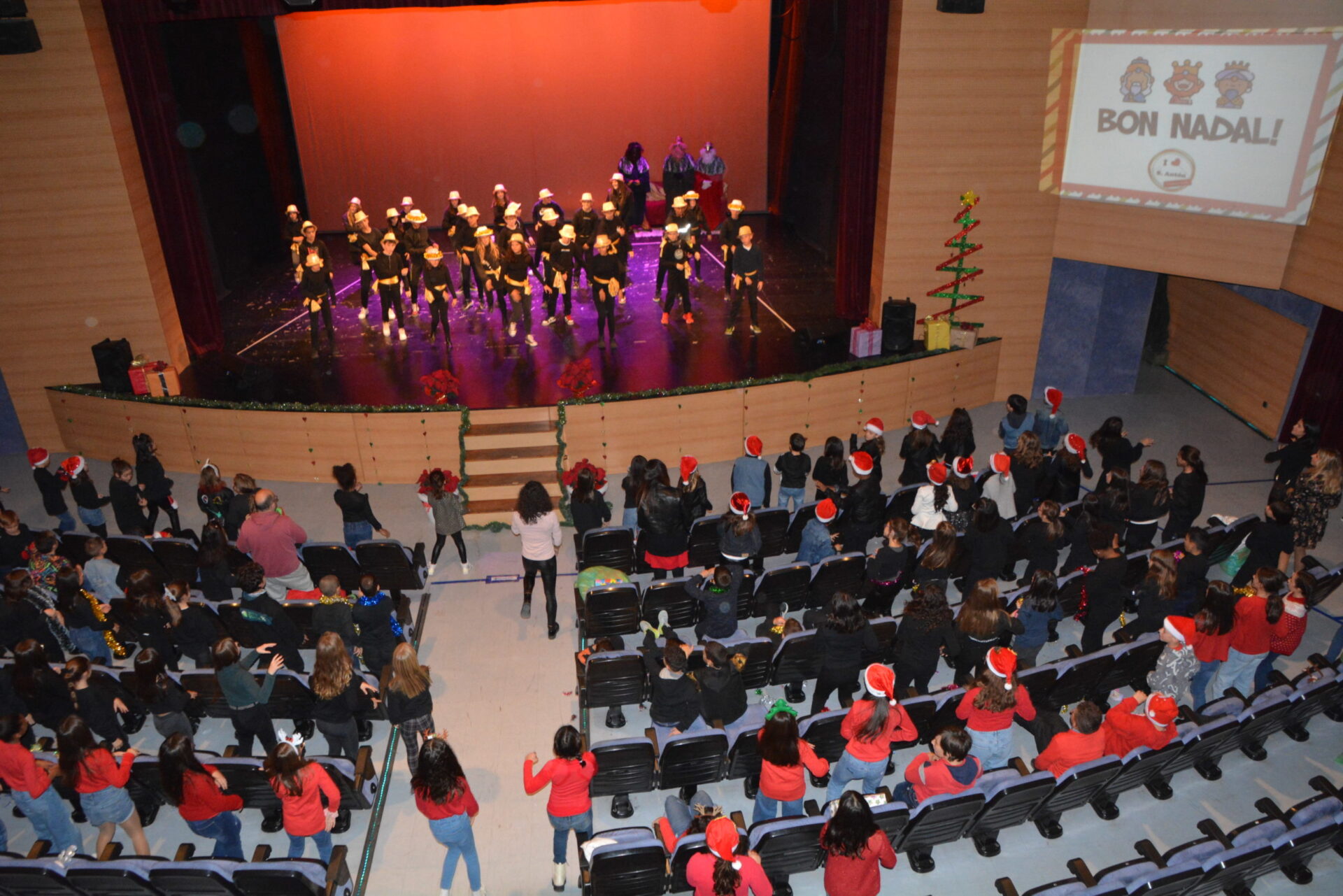 L’alumnat, per cursos, que ha pujat a l’escenari per interpretar conegudes nadales, algunes amb un ritme diferent, altres amb instruments, altres ballades amb coreografies.