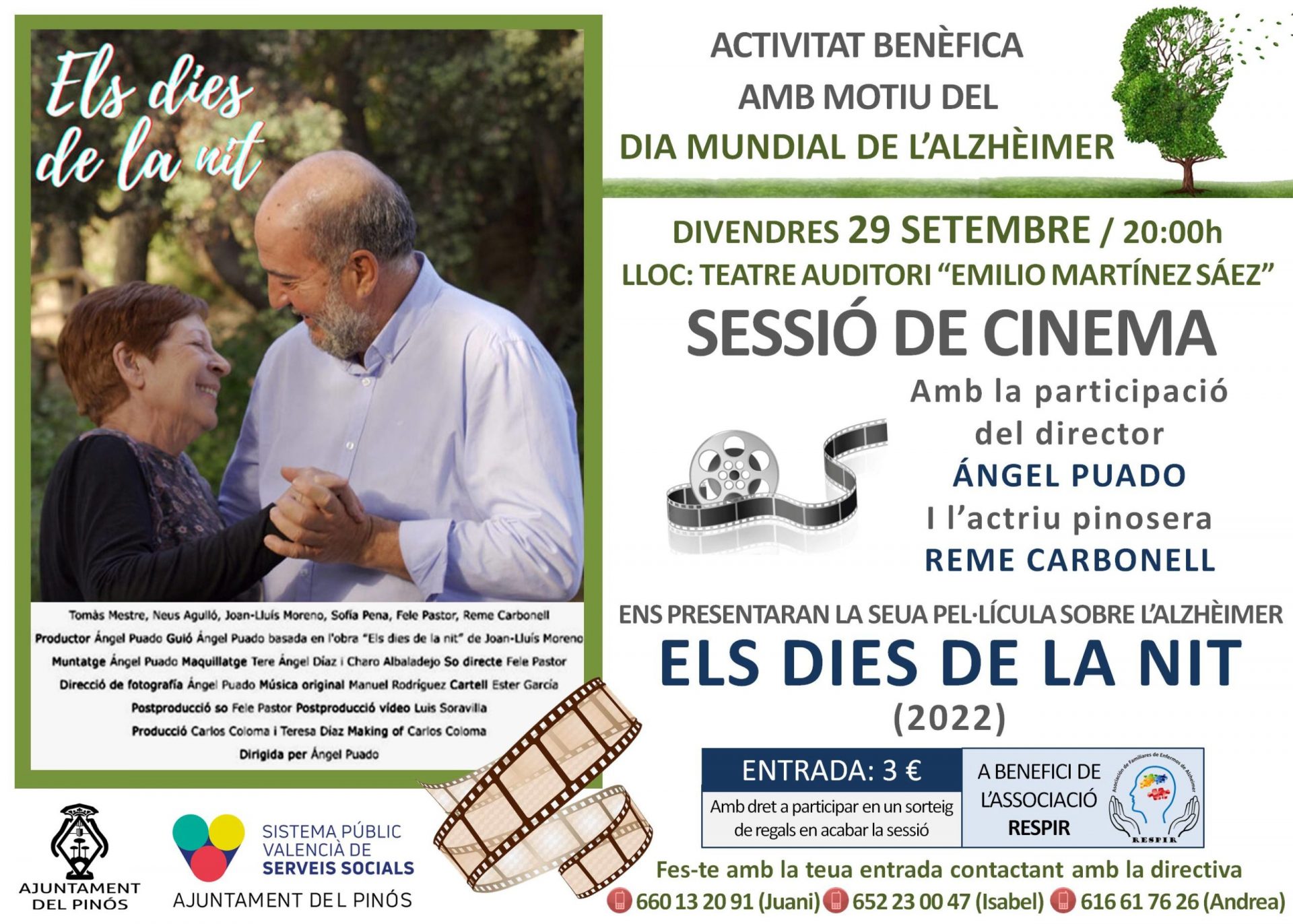 Amb motiu del Dia Mundial de l’Alzheimer, que es commemora el 21 de setembre, el municipi del Pinós acollirà la projecció de la pel·lícula “Els dies de la nit” del cineasta alacantí Ángel Puado, el divendres 28 de setembre, a les 20 hores, en el Teatre-Auditori “Emilio Martínez Sáez”, amb l’assistència del seu director, Ángel Puado, i de l’actriu pinosera Reme Carbonell, que forma part del repartiment.