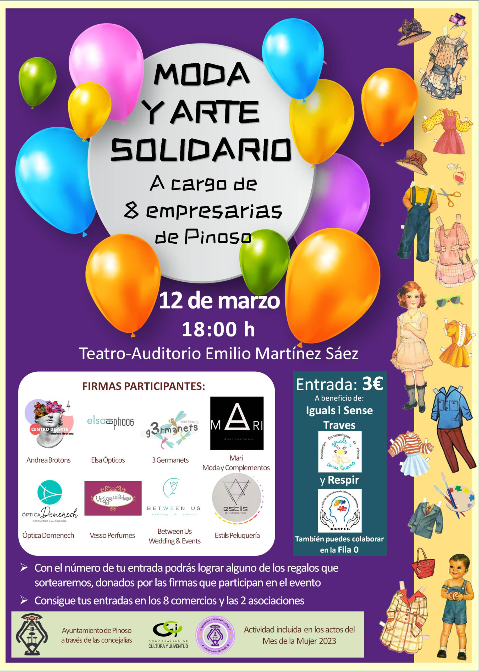 Un dels actes que s’han inclòs enguany tindrà lloc el diumenge 12 de març, amb el títol “Moda i Art Solidari”, a càrrec de 8 empresàries del Pinós. Serà al Teatre Auditori «Emilio Martínez Sáez», a partir de les 18 h., i `l’entrada és de 3euros, a benefici de les associacions «Iguals i Sense Traves» i «Respir». A més, amb l’entrada s’optarà a regals donats per les empreses participants.
