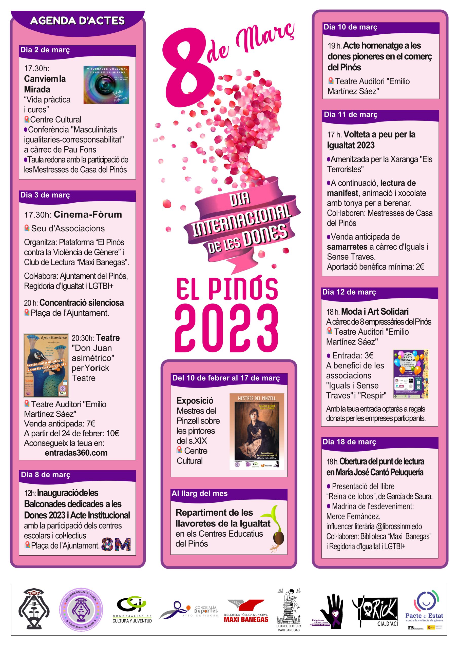 La Volteta a peu per la Igualtat 2023 es portarà a terme la vesprada del dia 11 de març, a les 17 h. En acabar el recorregut es procedirà a la lectura de manifest, acabant amb activitats d’animació i berenar amb xocolat amb tonya, on col·laboren les Mestresses de Casa del Pinós. Això sí, la Volteta a Peu per la Igualtat tornarà a tindre fins benèfics. La venda anticipada de les samarretes commemoratives, amb una aportació mínima de 2 euros, està a càrrec d’Iguals i Sense Traves.