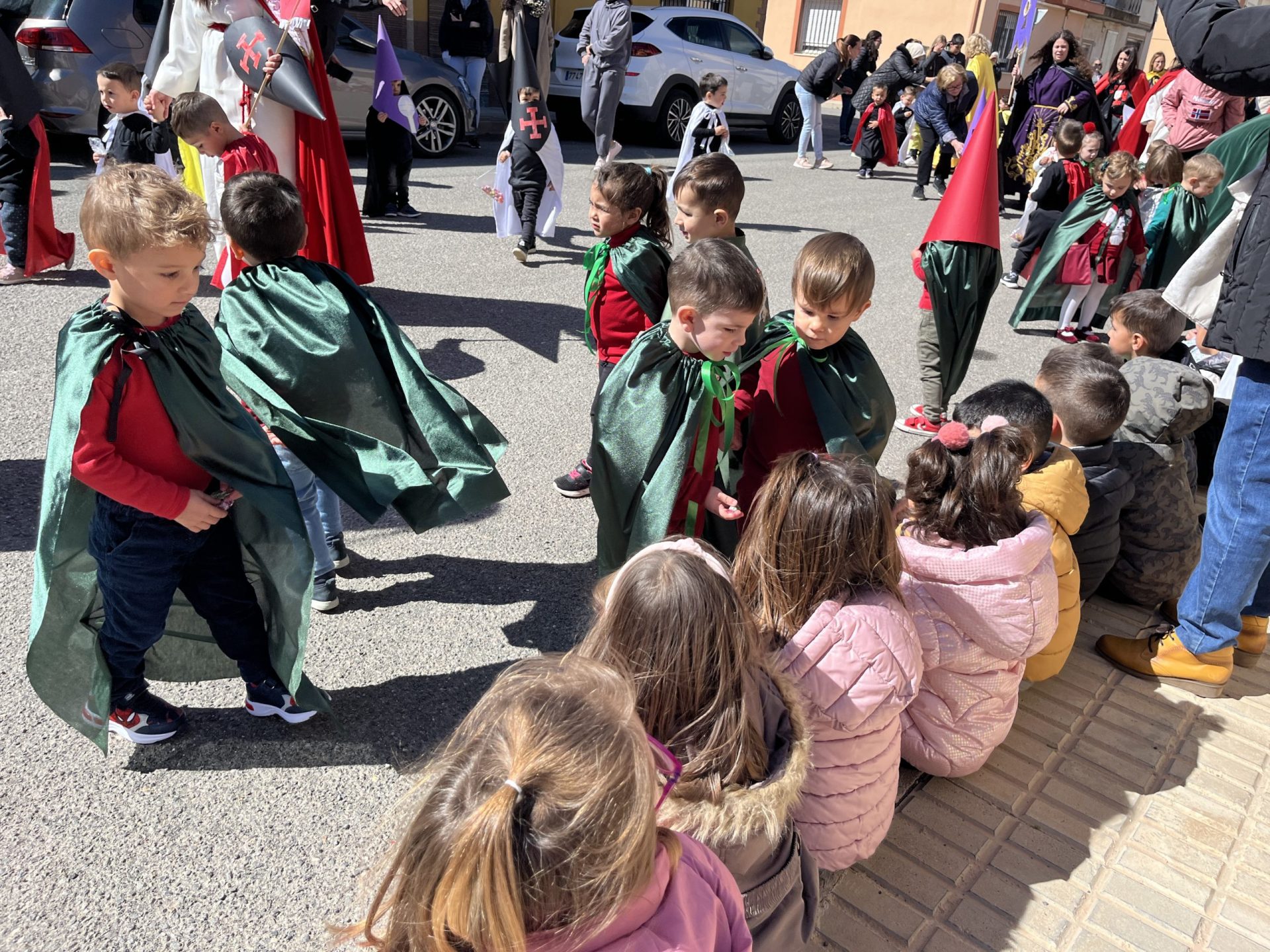 Este matí ventós de Dimecres Sant, l’Escola Infantil Municipal La Cometa ha dut a terme la seua particular processó, amb l’alumnat lluint els colors de les confraries i germanors de la Setmana Santa pinosera, membres de l’associació de familiars amb la vestimenta de diverses germanors, i tots ells acompanyats per la banda de cornetes i tambors Llàgrimes de Passió.