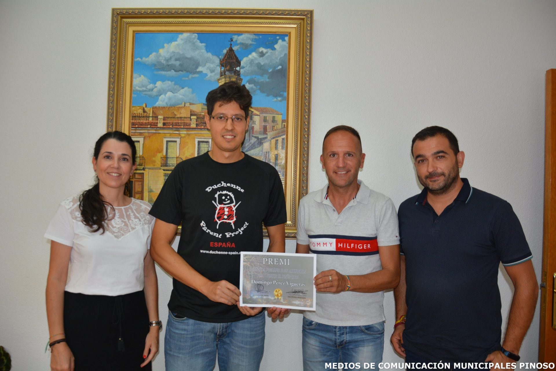 L’alcalde del Pinós, Lázaro Azorín, al costat de l’edil de Festes, Mª José Moya i el gerent de Pirotècnia Murciana, Juanjo Palazón, han fet lliurament del premi dotat amb 200 euros a Domingo Pérez Vigueras.