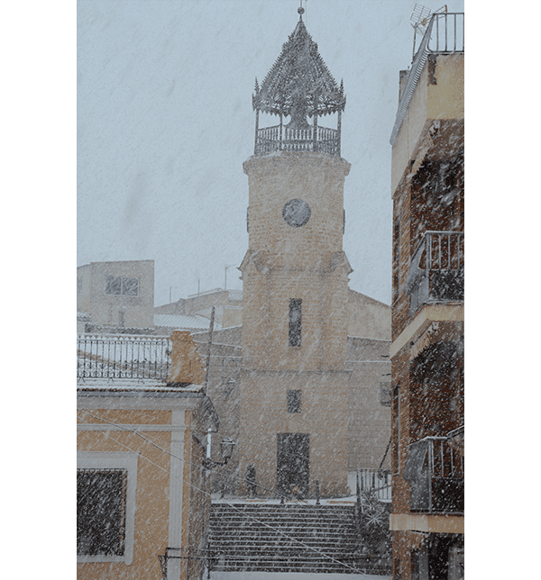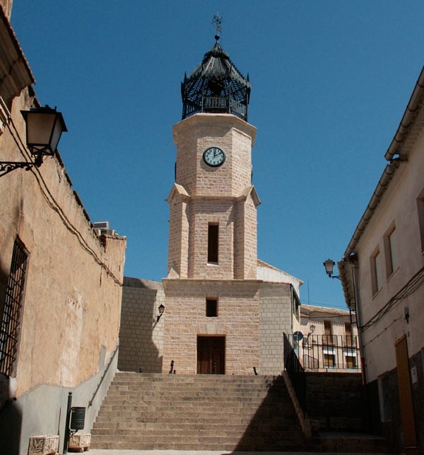 Su historia se remonta a 1887, siendo alcalde D. Francisco Rico Lucas, cuando se acuerda pedir un proyecto para una torre a los arquitectos de Alicante D. José Guardiola Picó y D. Enrique Sánchez Sedeño. En 1889 se compra en Madrid un reloj nuevo, por 11.000 ptas. (el actual), que se compondría de maquinaria, tres campanas (una clásica grande, y dos más pequeñas semiesféricas), cuatro esferas, las pesas para la cuerda y un campanil forjado para su sostén.