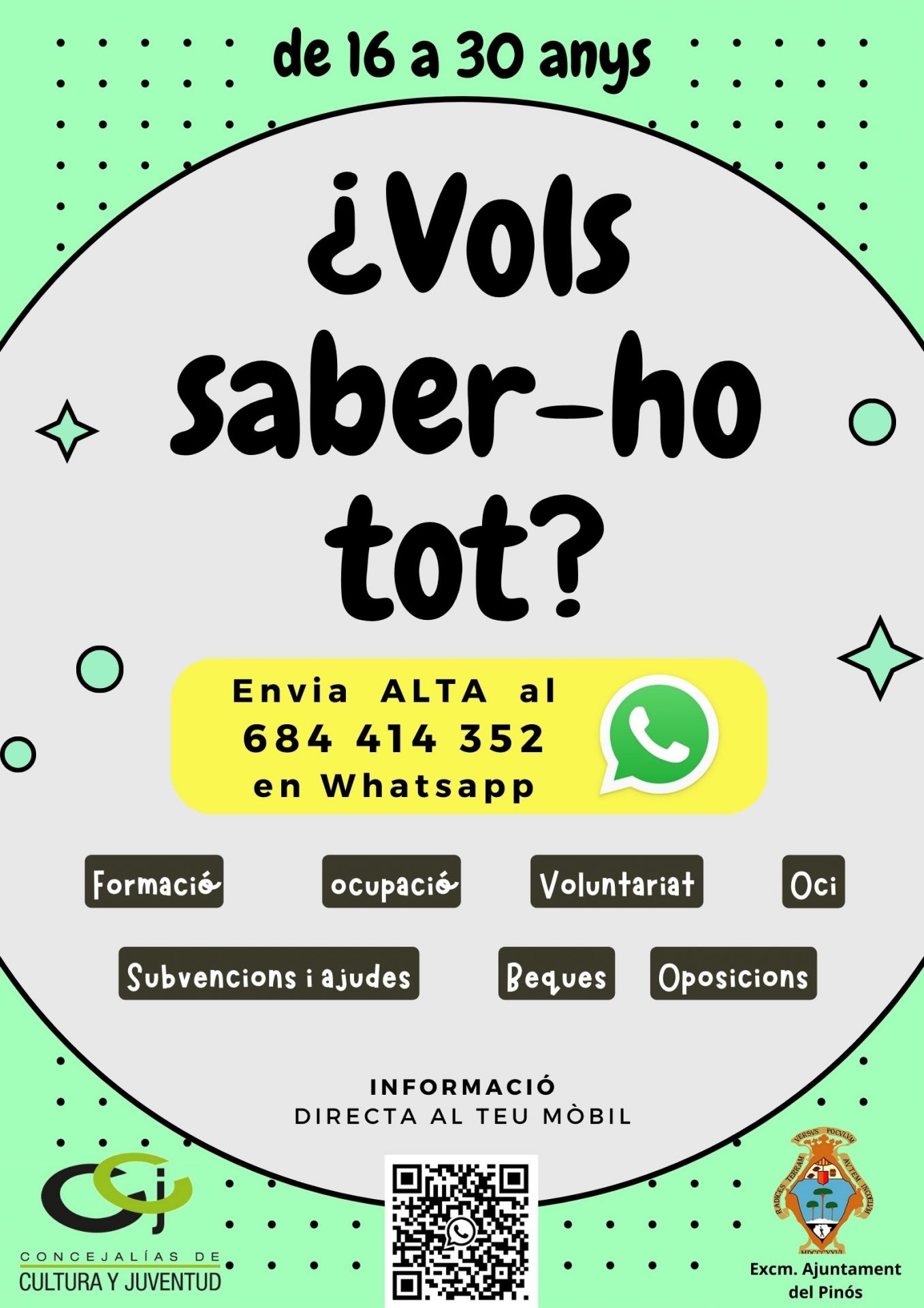 D’aquesta manera, la regidoria comptarà amb un número de whatsapp des del qual enviarà imatges, documents i enllaços a la gent jove que els puguen ser útils en les seues àrees d’interès com: oci i temps lliure, formació, ocupació, beques, voluntariat, subvencions i ajudes.