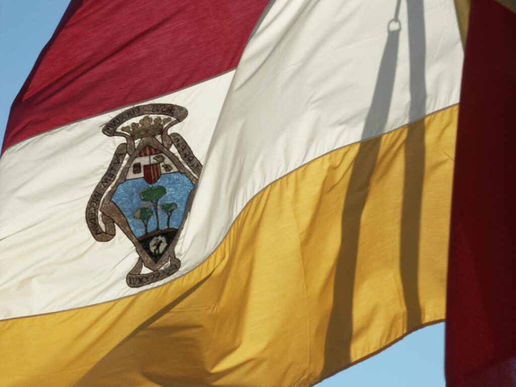 El primer elemento que se encuentra arriba es la “senyera” del Reino de Valencia.